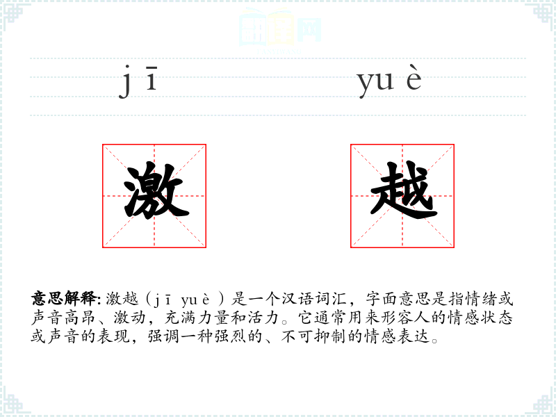 激越(jī yuè)是一个汉语词汇,字面意思是指情绪或声音高昂、激动,充满力量和活力。它通常用来形容人的情感状态或声音的表现,强调一种强烈的、不可抑制的情感表达。