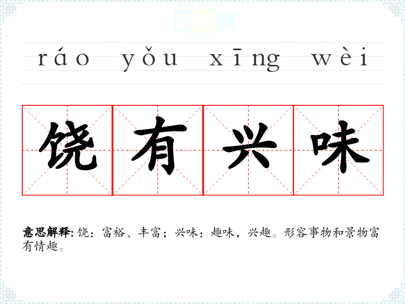饶:富裕、丰富;兴味:趣味,兴趣。形容事物和景物富有情趣。