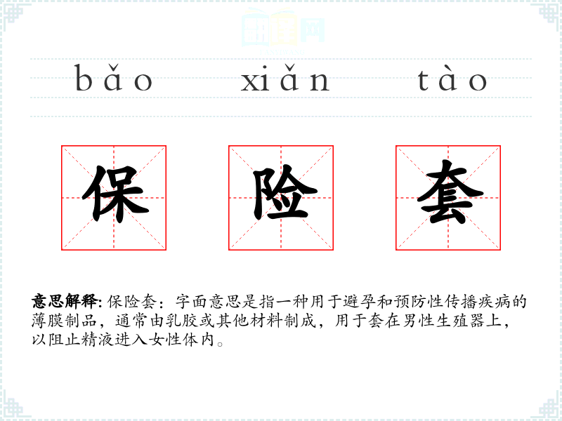 保险套:字面意思是指一种用于避孕和预防性传播疾病的*膜制品,通常由乳胶或其他材料制成,用于套在男性生殖器上,以阻止精液进入女性体内。