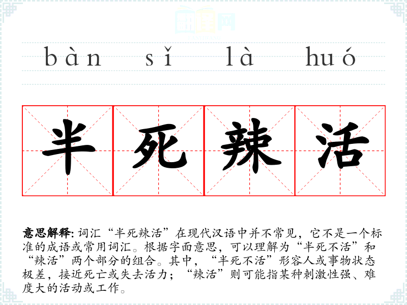 - “半死辣活”是一个富有表现力的词汇,虽然不常见,但在特定语境中可以有效地传达极端困境和挑战的情感。在语言学习和表达中,了解和掌握这类词汇可以丰富表达方式,增强语言的生动性和表现力。