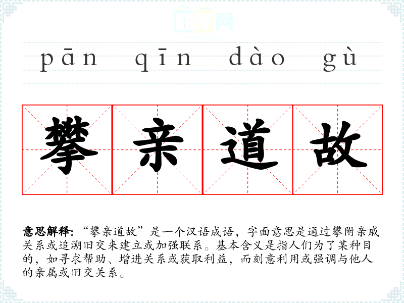 “攀亲道故”是一个汉语成语,字面意思是通过攀附亲戚关系或追溯旧交来建立或加强联系。基本含义是指人们为了某种目的,如寻求帮助、增进关系或获取利益,而刻意利用或强调与他人的亲属或旧交关系。