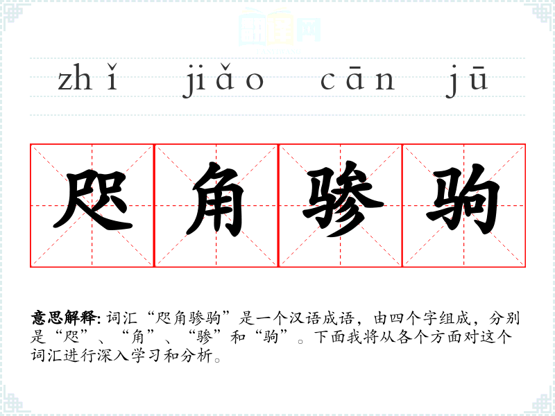 词汇“咫角骖驹”是一个汉语成语,由四个字组成,分别是“咫”、“角”、“骖”和“驹”。下面我将从各个方面对这个词汇进行深入学*和分析。
