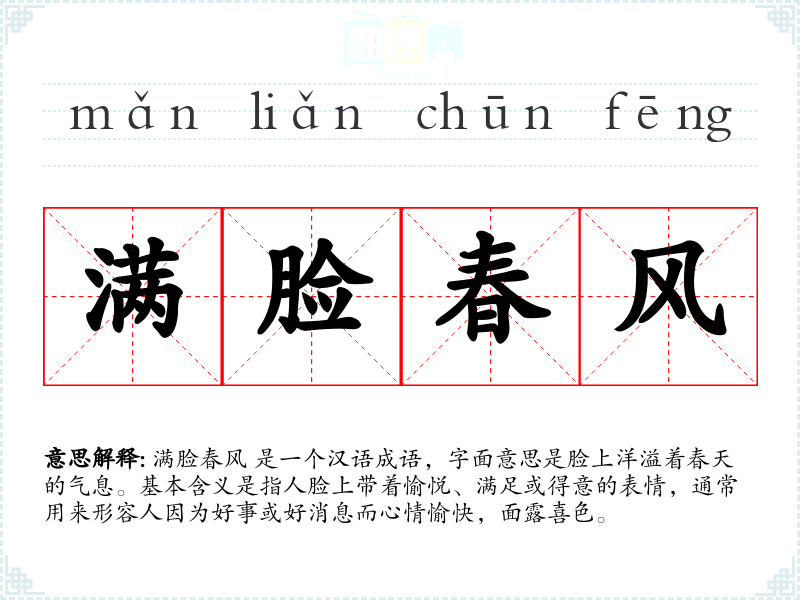 满脸春风 是一个汉语成语,字面意思是脸上洋溢着春天的气息。基本含义是指人脸上带着愉悦、满足或得意的表情,通常用来形容人因为好事或好消息而心情愉快,面露喜色。