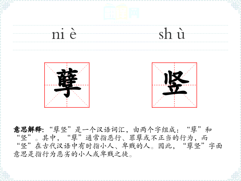 “孽”字最早见于《说文解字》,原意为罪恶、不正当。“竖”字则有竖立、卑贱之意。两个字组合成“孽竖”,在古代文献中已有使用,主要用来形容道德败坏的人。
