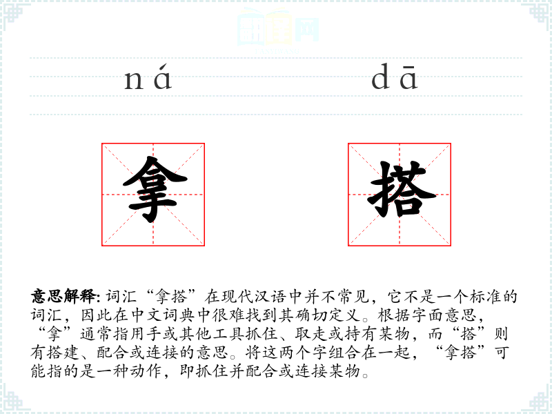 词汇“拿搭”在现代汉语中并不常见,它不是一个标准的词汇,因此在中文词典中很难找到其确切定义。根据字面意思,“拿”通常指用手或其他工具抓住、取走或持有某物,而“搭”则有搭建、配合或连接的意思。将这两个字组合在一起,“拿搭”可能指的是一种动作,即抓住并配合或连接某物。