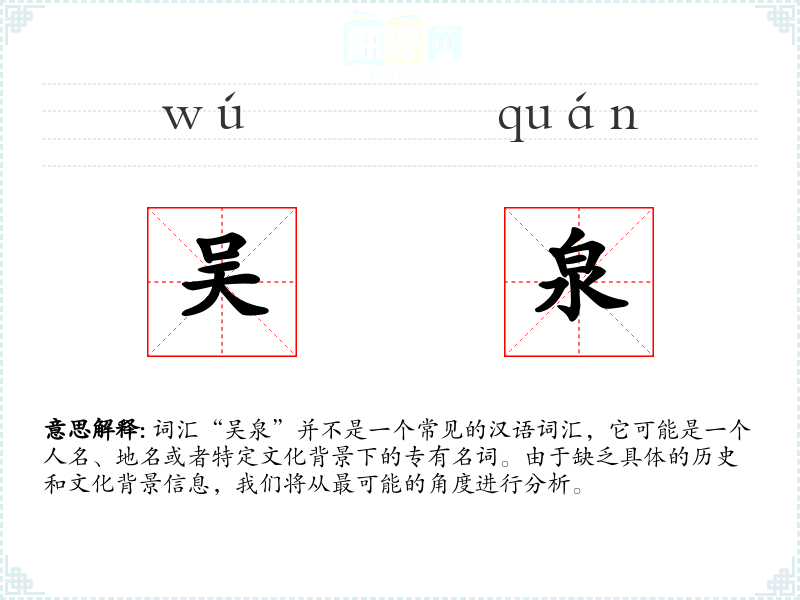 - 反义词:由于“吴泉”不是一个常用词汇,反义词不明显。