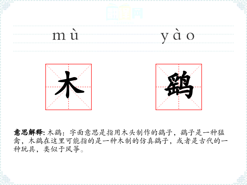 同义词:风筝、木鸟、仿真鸟 反义词:无(因为木鹞不是一个常用词汇,所以没有明确的反义词)