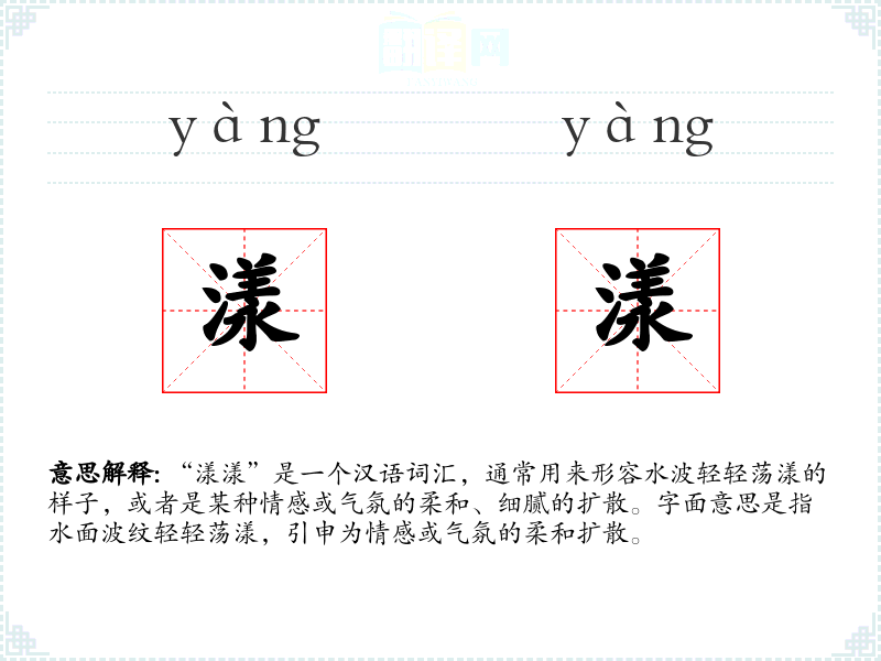 “漾漾”是一个汉语词汇,通常用来形容水波轻轻荡漾的样子,或者是某种情感或气氛的柔和、细腻的扩散。字面意思是指水面波纹轻轻荡漾,引申为情感或气氛的柔和扩散。