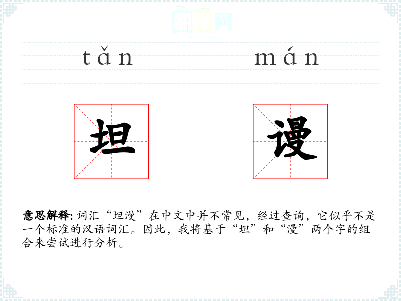 词汇“坦漫”在中文中并不常见,经过查询,它似乎不是一个标准的汉语词汇。因此,我将基于“坦”和“漫”两个字的组合来尝试进行分析。