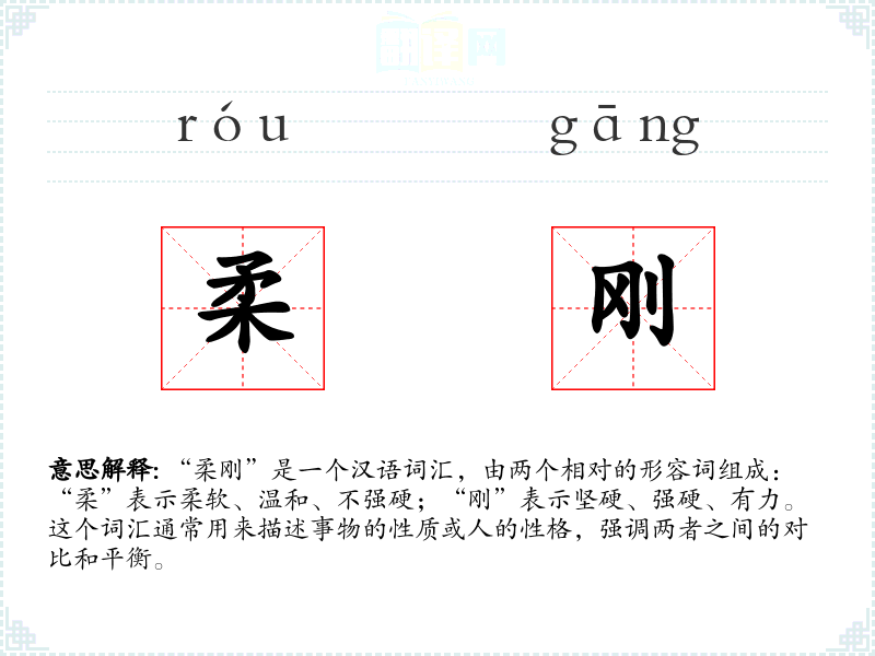 “柔刚”是一个汉语词汇,由两个相对的形容词组成:“柔”表示柔软、温和、不强硬;“刚”表示坚硬、强硬、有力。这个词汇通常用来描述事物的性质或人的性格,强调两者之间的对比和平衡。