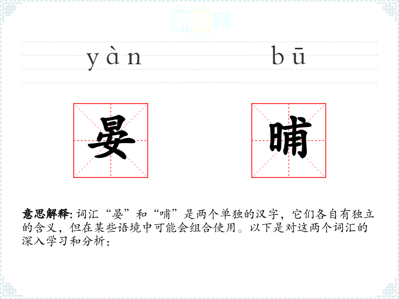 词汇“晏”和“哺”是两个单独的汉字,它们各自有独立的含义,但在某些语境中可能会组合使用。以下是对这两个词汇的深入学*和分析: