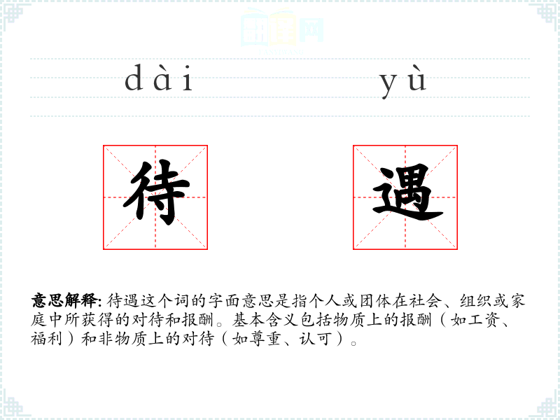 待遇这个词的字面意思是指个人或团体在社会、组织或家庭中所获得的对待和报酬。基本含义包括物质上的报酬(如工资、福利)和非物质上的对待(如尊重、认可)。