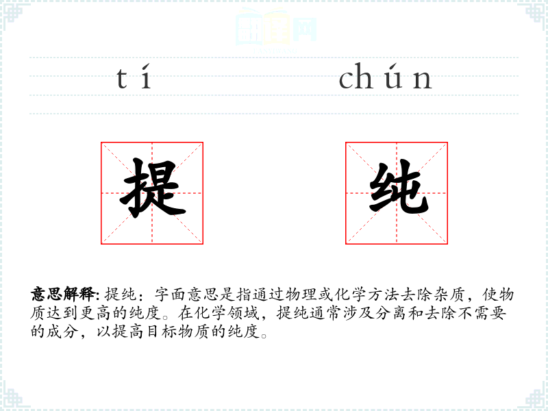 提纯:字面意思是指通过物理或化学方法去除杂质,使物质达到更高的纯度。在化学领域,提纯通常涉及分离和去除不需要的成分,以提高目标物质的纯度。