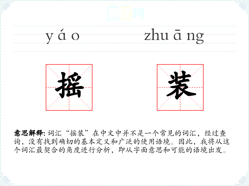 由于“摇装”不是一个标准词汇,我无法对其进行深入的理解和总结。在语言学习和表达中,遇到不常见的词汇时,最好的做法是查阅权威的词典或资料,以确保准确理解和使用。