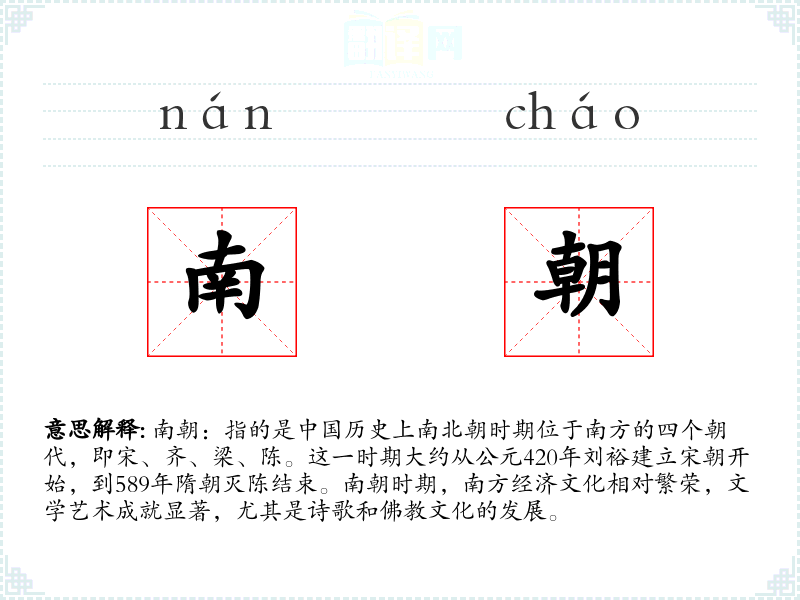 - 同义词:南朝可以与“南朝四国”、“南朝文化”等词汇互换,但后者更侧重于文化和地理概念。