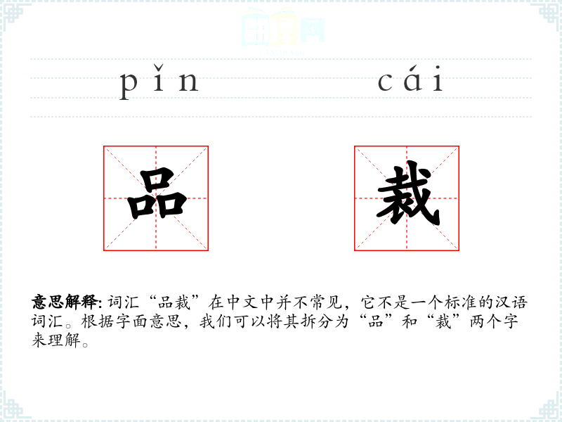 词汇“品裁”在中文中并不常见,它不是一个标准的汉语词汇。根据字面意思,我们可以将其拆分为“品”和“裁”两个字来理解。