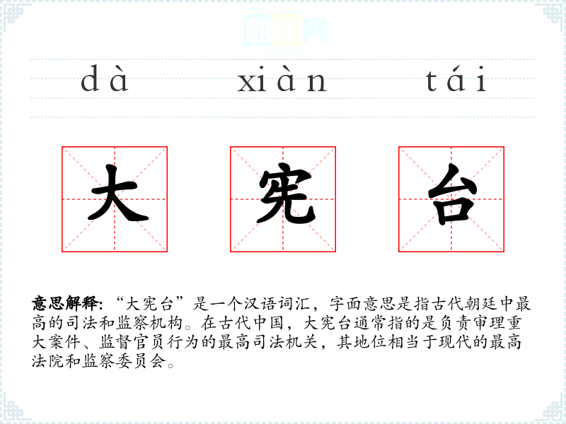 “大宪台”是一个汉语词汇,字面意思是指古代朝廷中最高的司法和监察机构。在古代**,大宪台通常指的是负责审理重大案件、监督官员行为的最高司法机关,其地位相当于现代的最高法院和监察委员会。