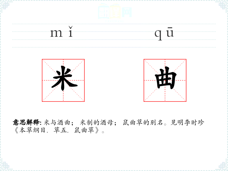 米与酒曲; 米制的酒母; 鼠曲草的别名。见明李时珍《本草纲目.草五.鼠曲草》。
