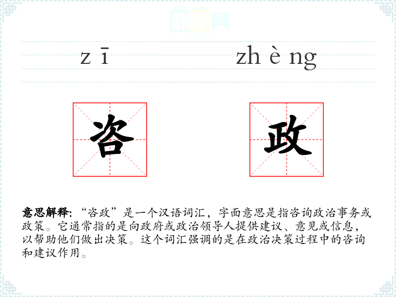 “咨政”是一个汉语词汇,字面意思是指咨询政治事务或政策。它通常指的是向政府或政治领导人提供建议、意见或信息,以帮助他们做出决策。这个词汇强调的是在政治决策过程中的咨询和建议作用。