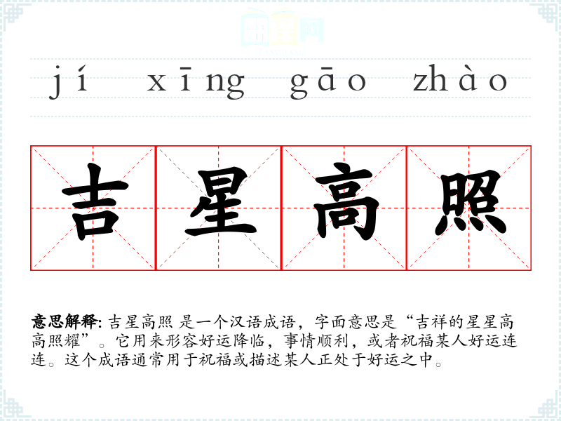 吉星高照 是一个汉语成语,字面意思是“吉祥的星星高高照耀”。它用来形容好运降临,事情顺利,或者祝福某人好运连连。这个成语通常用于祝福或描述某人正处于好运之中。