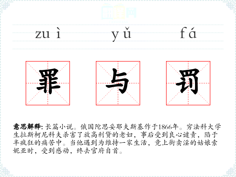 1.长篇小说。俄国陀思妥耶夫斯基作于1866年。穷法科大学生拉斯柯尼科夫杀害了放高利贷的老妇,事后受到良心谴责,陷于半疯狂的痛苦中。当他遇到为维持一家生活,竟上街卖淫的姑娘索妮亚时,受到感动,终去官府自首。