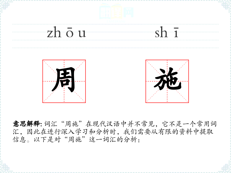 “周”字在古代汉语中有普遍、全面的意思,“施”字则有施予、施行的含义。两者结合,形成了“周施”这一词汇,但在现代汉语中已经不常用。