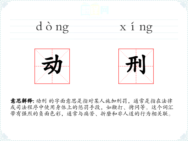 动刑 的字面意思是指对某人施加刑罚,通常是指在法律或司法程序中使用身体上的惩罚手段,如鞭打、拷问等。这个词汇带有强烈的负面色彩,通常与痛苦、折磨和非人道的行为相关联。