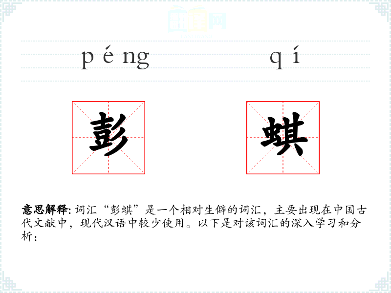 词汇“彭蜞”是一个相对生僻的词汇,主要出现在*古代文献中,现代汉语中较少使用。以下是对该词汇的深入学和分析: