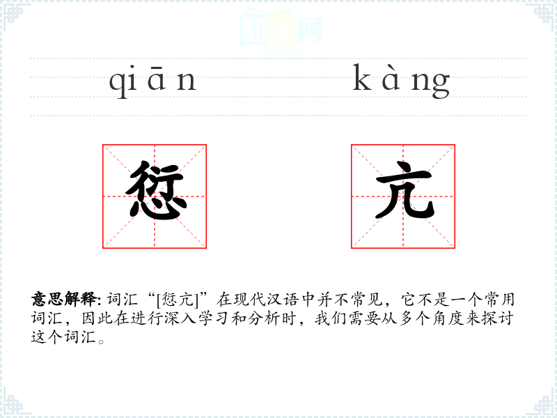 词汇“[愆亢]”在现代汉语中并不常见,它不是一个常用词汇,因此在进行深入学*和分析时,我们需要从多个角度来探讨这个词汇。