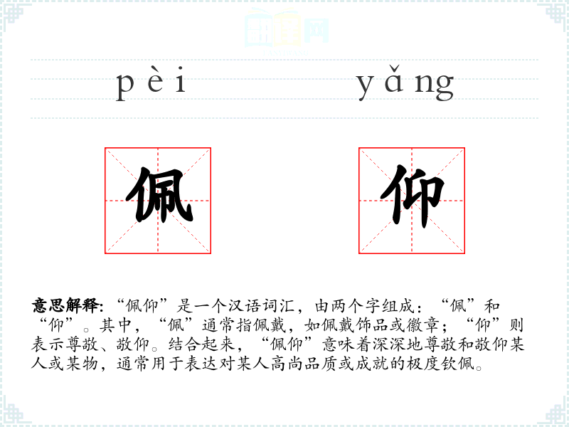 在英语中,“佩仰”可以对应为“admiration”或“reverence”。虽然这些词汇在情感强度上可能有所不同,但它们都表达了尊敬和敬仰的情感。