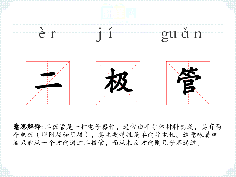 在不同语言中,二极管的名称可能有所不同,但其功能和应用基本一致。例如,在德语中称为“Diode”,在法语中称为“Diode”。