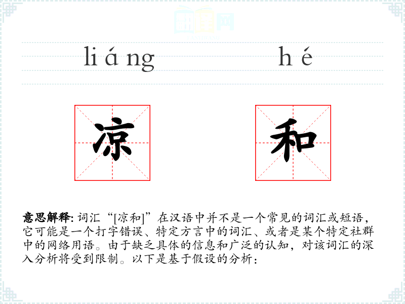 综上所述,由于“[凉和]”不是一个已知或常见的汉语词汇,对其的深入分析和学习受到了限制。如果这是一个特定语境下的词汇,需要更多的上下文信息来进行准确的分析。