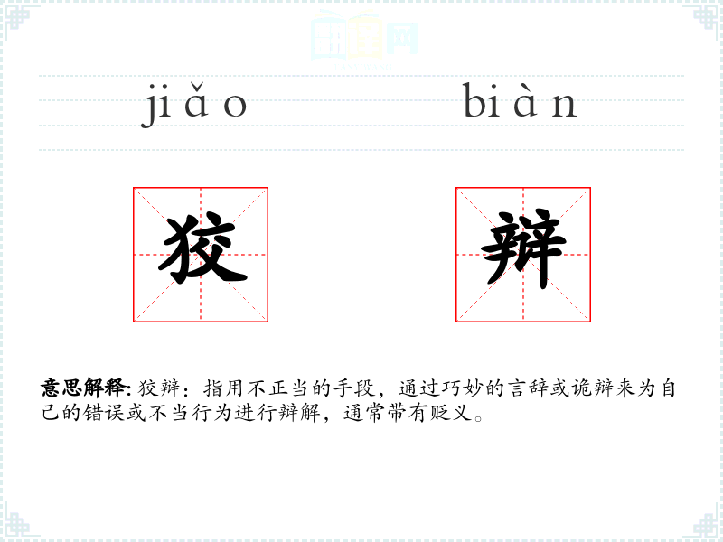 - 词源:狡辩一词由“狡”和“辩”组成,“狡”意为狡猾,“辩”意为辩论或辩解。