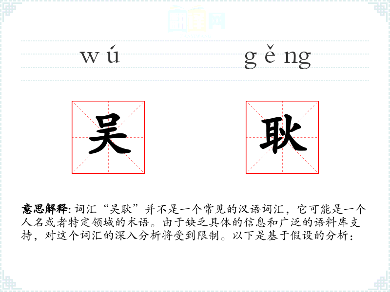 由于“吴耿”不是一个常见的词汇,以上的分析大多是基于假设的。如果能够提供更多的上下文信息,分析将更加准确和深入。
