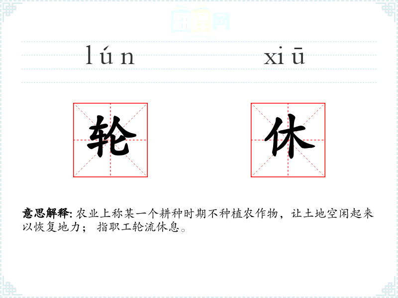 农业上称某一个耕种时期不种植农作物,让土地空闲起来以恢复地力; 指职工轮流休息。