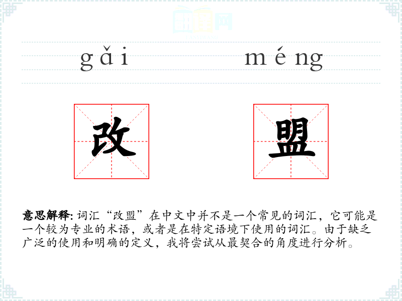 词汇“改盟”在中文中并不是一个常见的词汇,它可能是一个较为专业的术语,或者是在特定语境下使用的词汇。由于缺乏广泛的使用和明确的定义,我将尝试从最契合的角度进行分析。