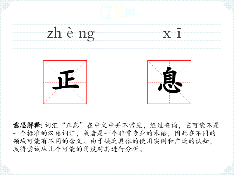 由于“正息”不是一个常见的词汇,我们无法给出一个确切的基本定义。它可能是某个特定领域(如金融、物理学或工程学)的术语,或者是某个方言中的词汇。