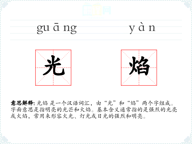 - 同义词:光辉、光芒、火光