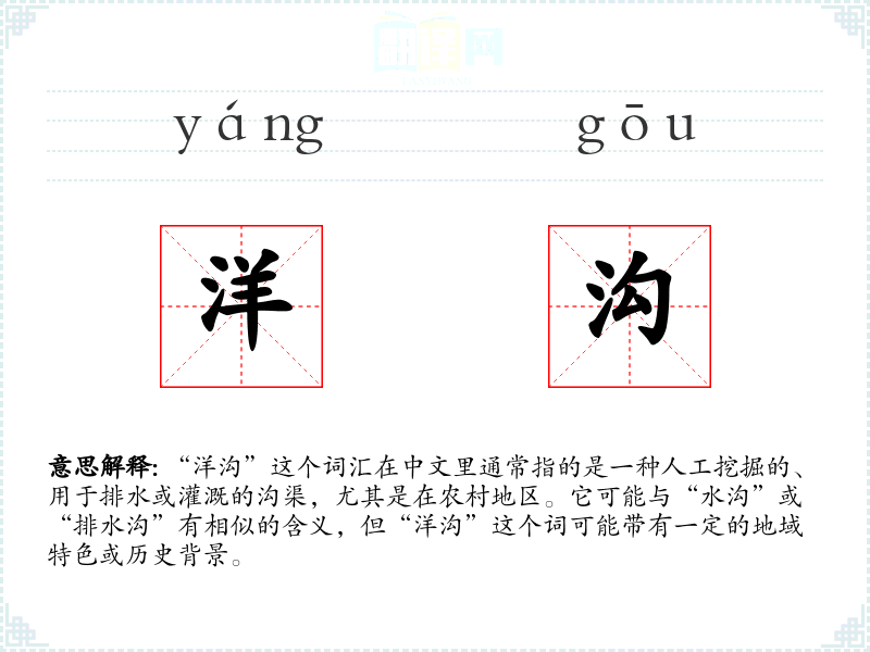 “洋沟”这个词汇在中文里通常指的是一种人工挖掘的、用于排水或灌溉的沟渠,尤其是在农村地区。它可能与“水沟”或“排水沟”有相似的含义,但“洋沟”这个词可能带有一定的地域特色或历史背景。