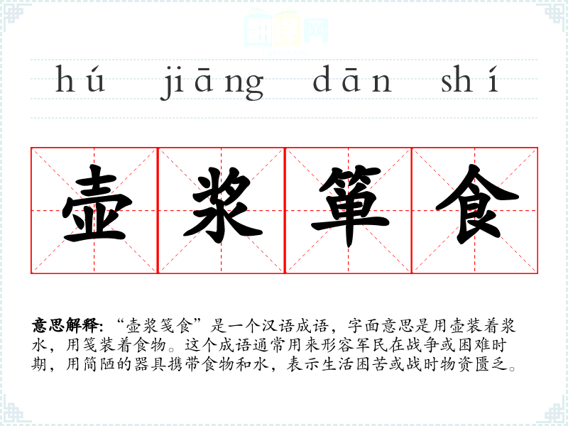 “壶浆笺食”是一个汉语成语,字面意思是用壶装着浆水,用笺装着食物。这个成语通常用来形容军民在战争或困难时期,用简陋的器具携带食物和水,表示生活困苦或战时物资匮乏。