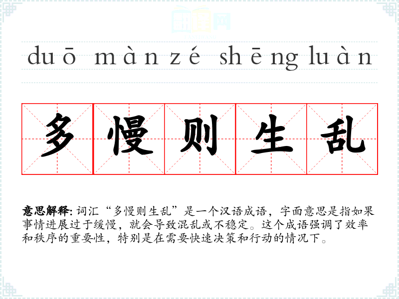 “多慢则生乱”字面意思是指如果事情进展过于缓慢,就会导致混乱或不稳定。这个成语通常用来警示人们,在处理事务时要注意速度和效率,以免因拖延而导致问题。