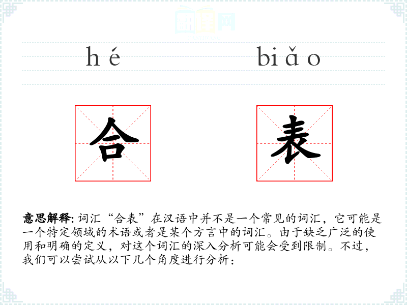 由于“合表”不是一个标准汉语词汇,对其的分析和理解受到限制。在语言学习和表达中,了解和掌握标准和常用的词汇更为重要。如果“合表”是一个特定领域的术语,那么了解它在特定语境中的含义和用法将是有益的。