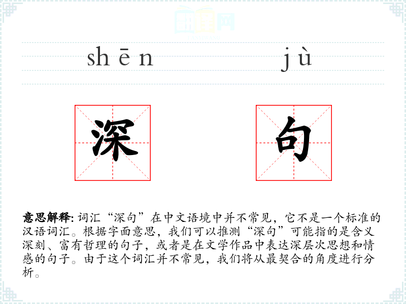 词汇“深句”在中文语境中并不常见,它不是一个标准的汉语词汇。根据字面意思,我们可以推测“深句”可能指的是含义深刻、富有哲理的句子,或者是在文学作品中表达深层次思想和情感的句子。由于这个词汇并不常见,我们将从最契合的角度进行分析。