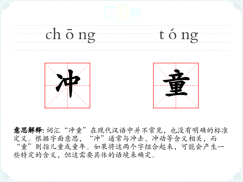 由于“冲童”不是一个标准词汇,我们无法给出一个确切的基本定义。它可能是一个方言词汇、特定社群中的术语,或者是某个特定文献中的创造性用法。