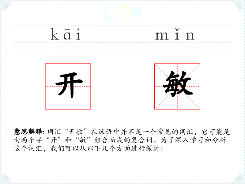 词汇“开敏”在汉语中并不是一个常见的词汇,它可能是由两个字“开”和“敏”组合而成的复合词。为了深入学习和分析这个词汇,我们可以从以下几个方面进行探讨: