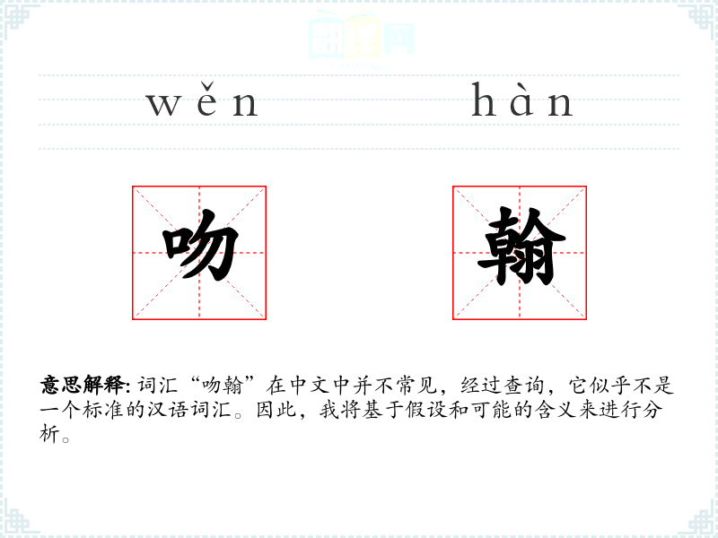 词汇“吻翰”在中文中并不常见,经过查询,它似乎不是一个标准的汉语词汇。因此,我将基于假设和可能的含义来进行分析。