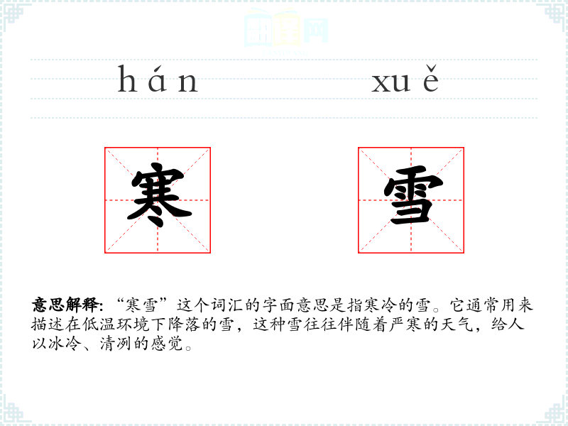 “寒雪”这个词汇在中文中历史悠久,其构成简单明了,由“寒”和“雪”两个字组成。在古代文学中,“寒雪”就已经被用来形容寒冷的雪景,其用法和意义在历史长河中基本保持稳定。