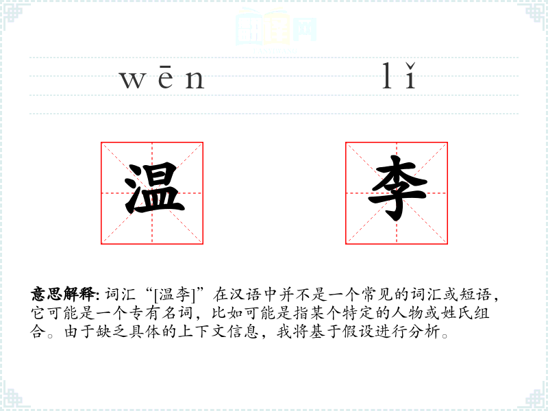 词汇“[温李]”在汉语中并不是一个常见的词汇或短语,它可能是一个专有名词,比如可能是指某个特定的人物或姓氏组合。由于缺乏具体的上下文信息,我将基于假设进行分析。