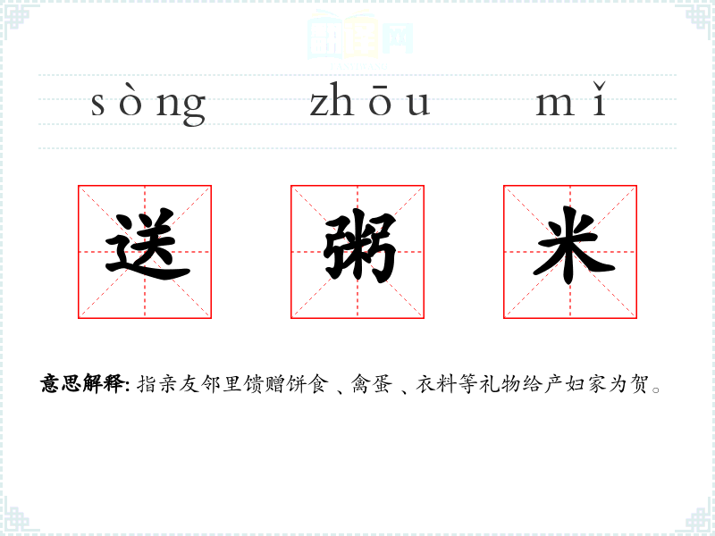 指亲友邻里馈赠饼食﹑禽蛋﹑衣料等礼物给产妇家为贺。