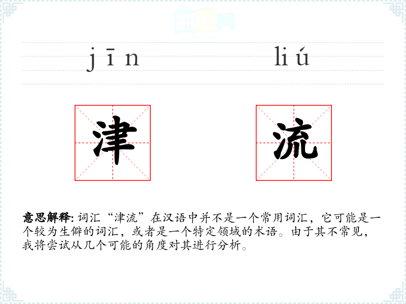 词汇“津流”在汉语中并不是一个常用词汇,它可能是一个较为生僻的词汇,或者是一个特定领域的术语。由于其不常见,我将尝试从几个可能的角度对其进行分析。